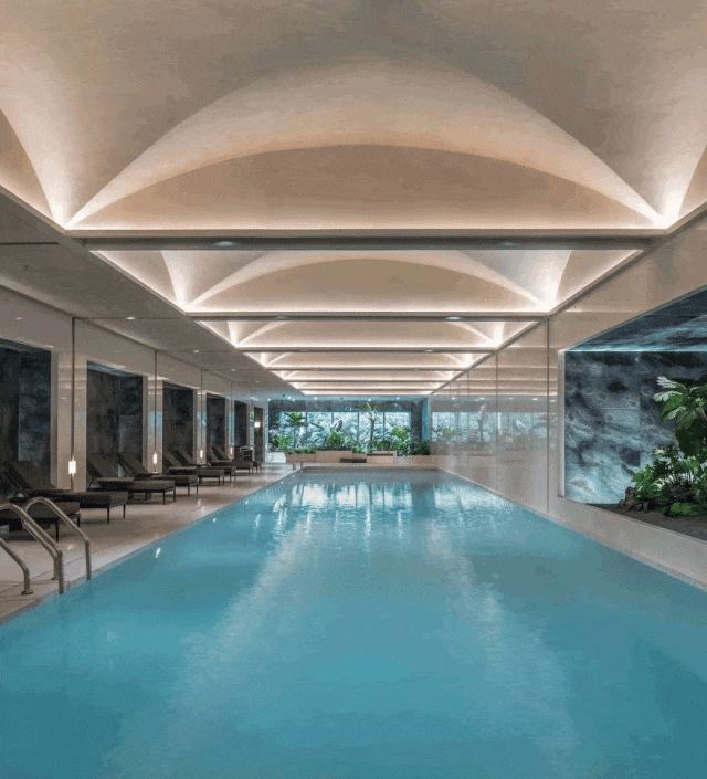 二楼通过专业餐酒吧设备、艺术光厅、女性友好健身房、上海首个度假感植物园泳池等营造艺术感会所,每一个空间都不是简单的功能间,而是化身艺术空间。